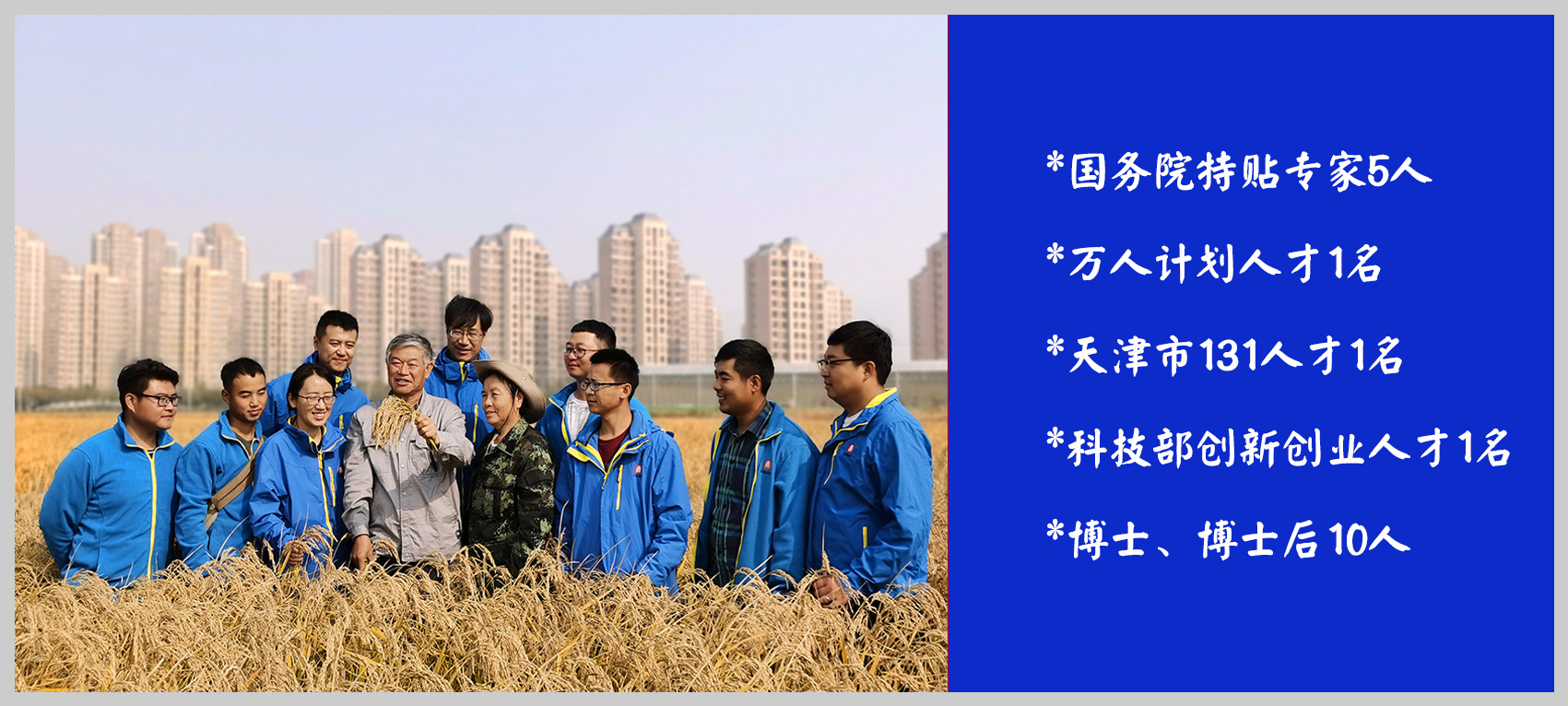 为充分发挥天隆科技股份公司科技研发人员的作用和力量,促进人才的成长和提高,推动公司技术创新和产业发展,公司始终秉持人才是第一资源的发展理念,成立了一支人员学科交叉、搭配合理的优质粳稻育种创新团队,其中国务院特贴专家5人,万人计划人才1名,天津市131人才1名,科技部创新创业人才1名,博士、博士后10人。团队涵盖粳稻技术研发、生产管理、市场开拓等方面人才,根据研发任务的需要,还聘请了国内粳稻知名专家万建民院士、罗锡文院士、谢华安院士等担任专家顾问,指导具体研发工作。天隆科技股份公司作为博士后工作站,吸引专业技术人才,目前在站博士后1名。