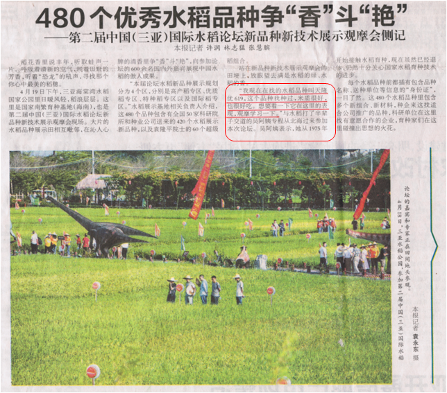 三亚日报报道优质米品种“天隆优619”