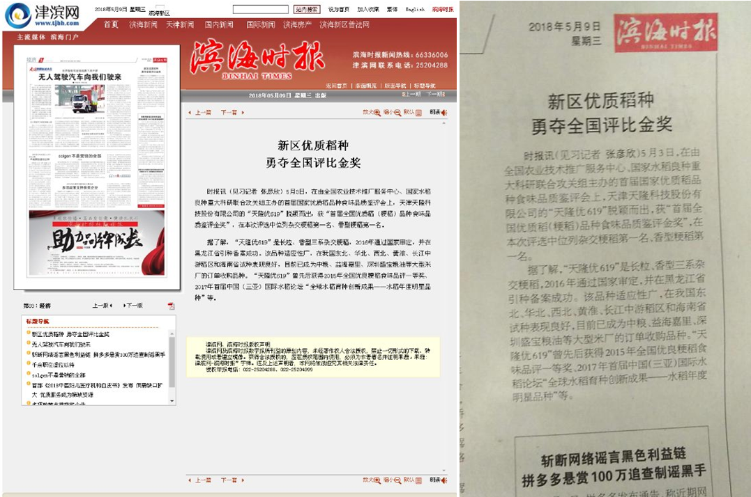 2018年5月2-3日,在广州举办国家优质稻品种攻关推进暨鉴评推介会,天隆优619荣获首届全国优质稻(粳稻)品种食味品质鉴评金奖,位列杂交粳稻第一名,香型粳稻第一名,名次位列稻花香之前。5月9日,滨海时报进行了天…11-12 2018 -