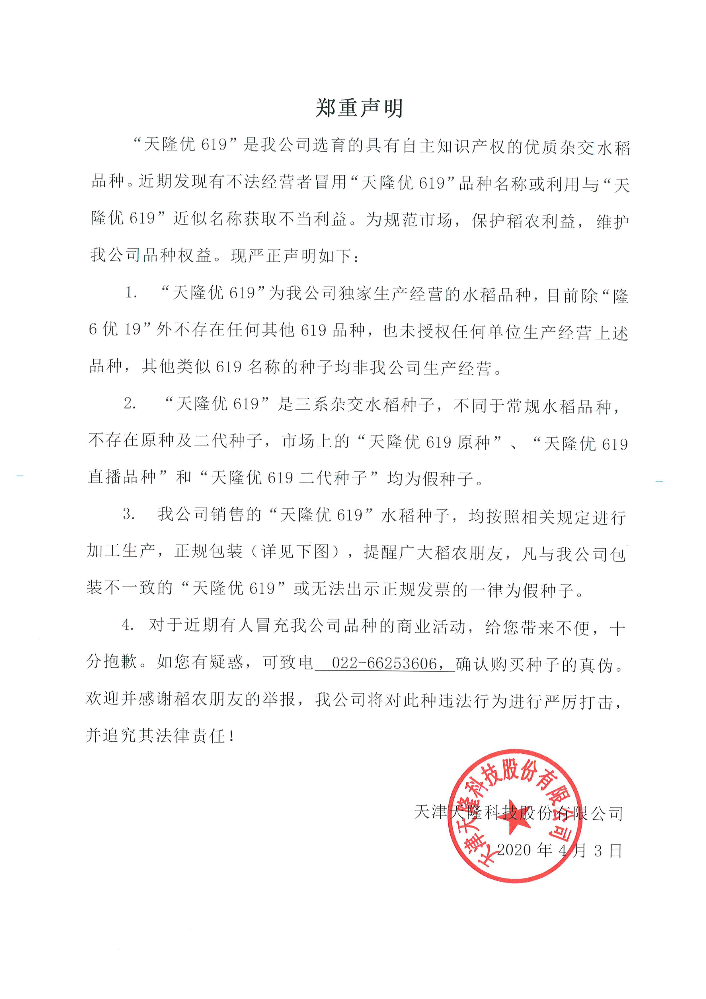 关于伪冒天隆优619的假种子声明