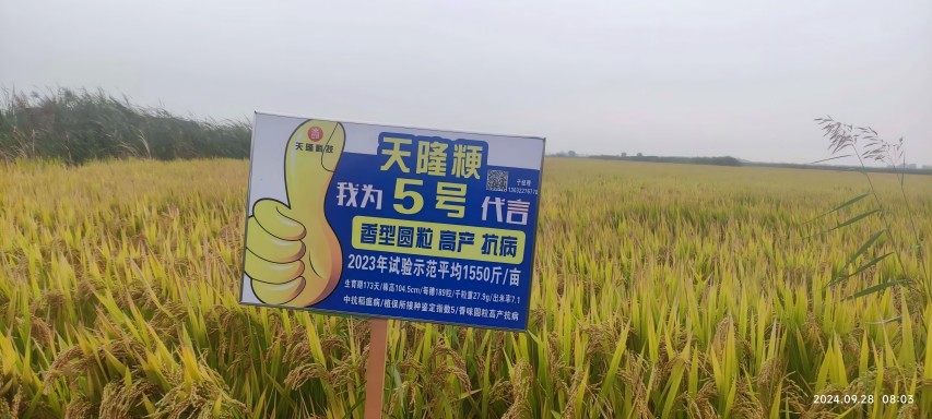 天隆粳5号由天隆科技选育,于2023年通过天津市审定及河北、北京引种,为香型圆粒常规粳稻品种,产量高,2023年试验示范平均亩产1550斤,出米率高达70%以上,茎干粗壮、抗倒伏,抗病性强,适宜京津冀春稻熟期种植。